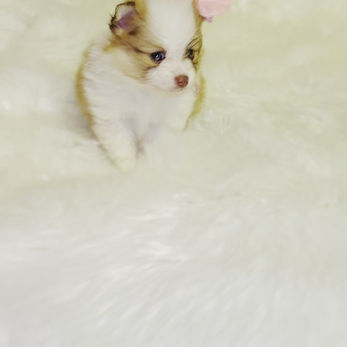 We are delighted to introduce this stunning Pomeranian female with a dazzling white coat beautifully marked with chocolate-colored spots. Her unique and elegant coloring makes her truly special and eye-catching.