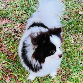We are delighted to introduce this stunning Pomeranian female with a dazzling white coat beautifully marked with chocolate-colored spots. Her unique and elegant coloring makes her truly special and eye-catching.